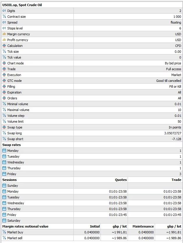 ข้อมูลส่วนนี้จะทำหน้าที่กำหนดเงื่อนไขการซื้อขายและช่วยให้คุณเข้าใจรายละเอียดเฉพาะตัวของตลาดที่คุณกำลังลงทุน รวมถึงวิธีการที่ออเดอร์ของคุณจะถูกดำเนินการ รายละเอียดสำคัญที่คุณจะพบใน Contract Specification ได้แก่ช่วงเวลาเปิด-ปิดตลาด (น้ำมันมีเวลาพักเบรก ไม่ได้เทรด 24 ชม. ตลอดเหมือน Forex) จำนวนบาร์เรลต่อการเทรด 1 Lot (เช่น 1 Lot = 100 บาร์เรล หรือ 1,000 บาร์เรล) ขนาด Lot ขั้นต่ำที่เปิดได้ และค่าธรรมเนียมสำหรับการถือออเดอร์ข้ามคืน